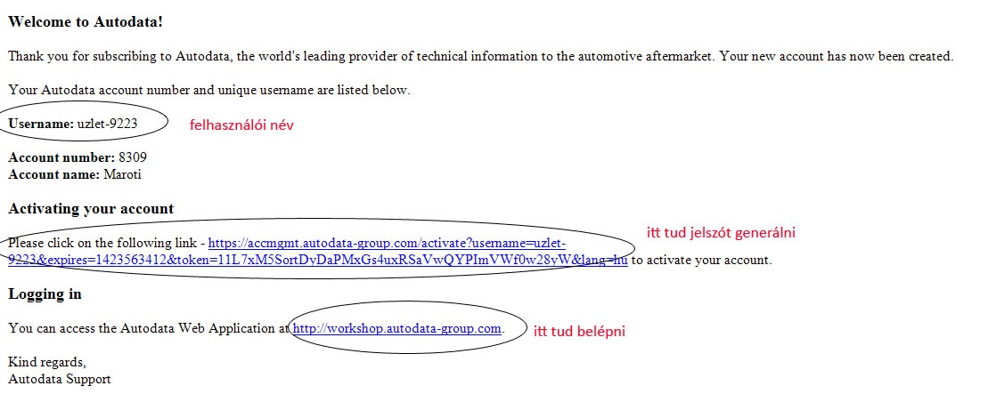 Az S&M vagy a D&R termék megvásárlása után a megadott email címére levelet kap az Autodatától, átmenetileg angol nyelven, melyben megtalálható a belépéshez szükséges felhasználói neve (username), illetve lehetősége van jelszavának beállítására is. A jelszó megadása után azonnal használhatóvá válik a program. Magyarázat a levélen, kérjük kattintson a képre.